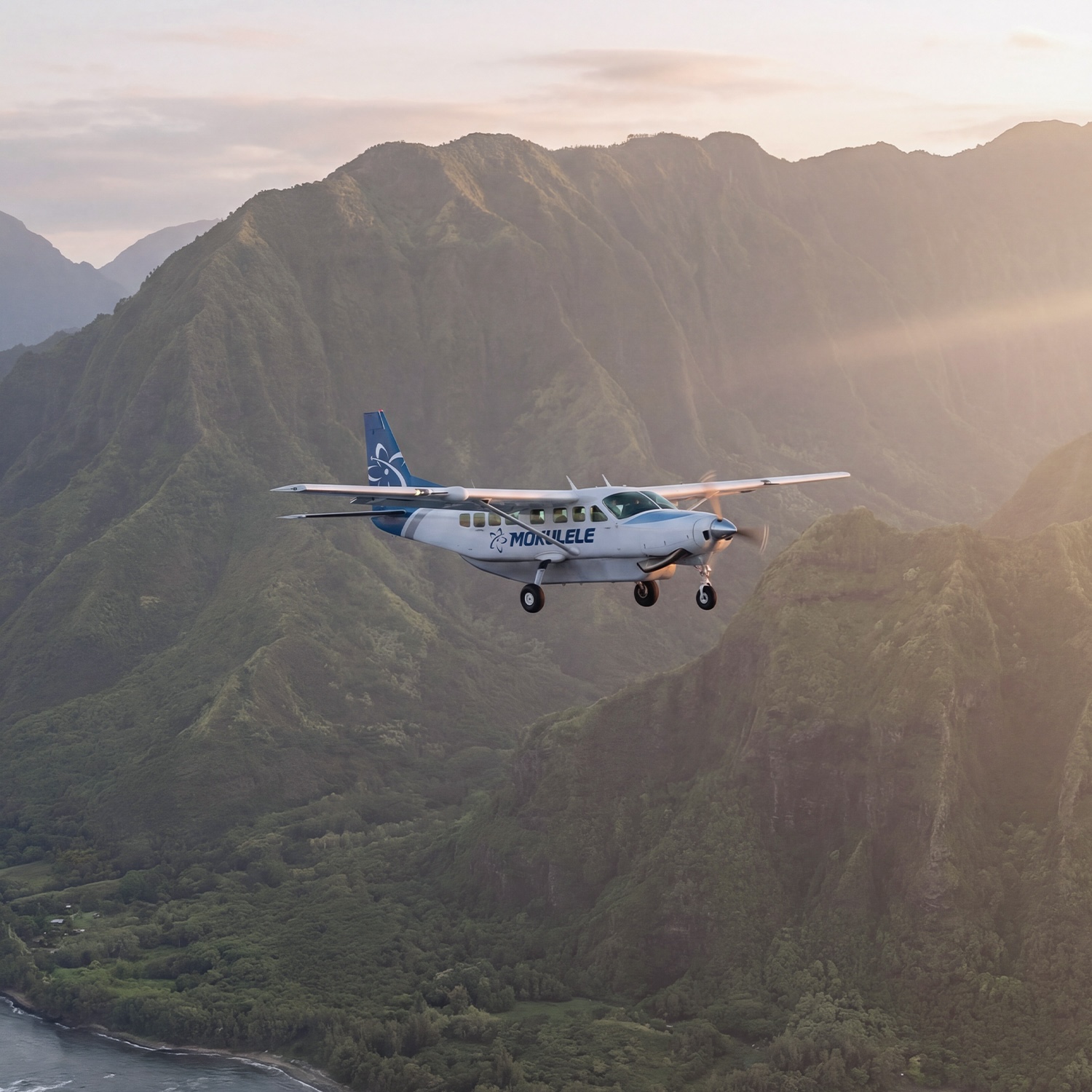 Mokulele operates a large fleet of Cessna Grand Caravans on commuter and regional routes. Every passenger enjoys both aisle access and a window, paired with expansive views that turn every flight into a front-row seat to the scenery below. -
